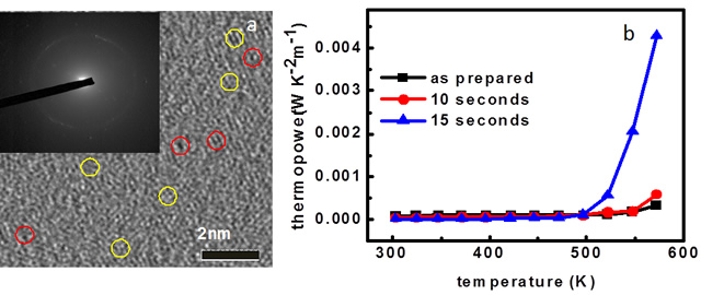 Figure 4. (a) HRTEM images of FLG films after oxygen plasma treatment. The inset shows the corresponding SAED pattern, which confirms the amorphous status for samples after oxygen plasma treatment. The yellow circles highlight small crystals of caron in such films while the red circles point out the disordered arrangement of carbon atoms. (b) Power factor for the FLG films after different oxygen plasma treatments.
