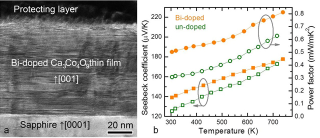 Figure 6. (a) TEM image of Bi-doped Ca3Co4O9 thin film. (b) Enhancement of Seebeck coefficient and power factor by Bi substitution.